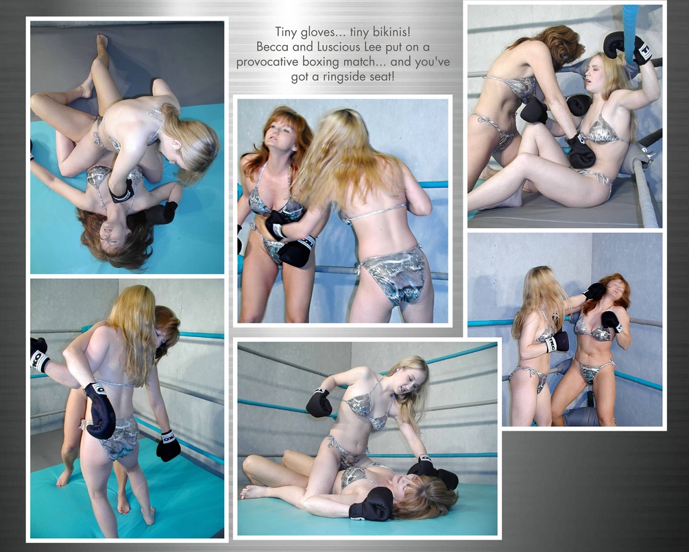 LEE faces BECCA once more, this time both ladies decked out in matching silver STRING bikinis! There are no rules and no rounds, and the girls slug away with abandon in gloves so small they protect the KNUCKLES but nothing ELSE!